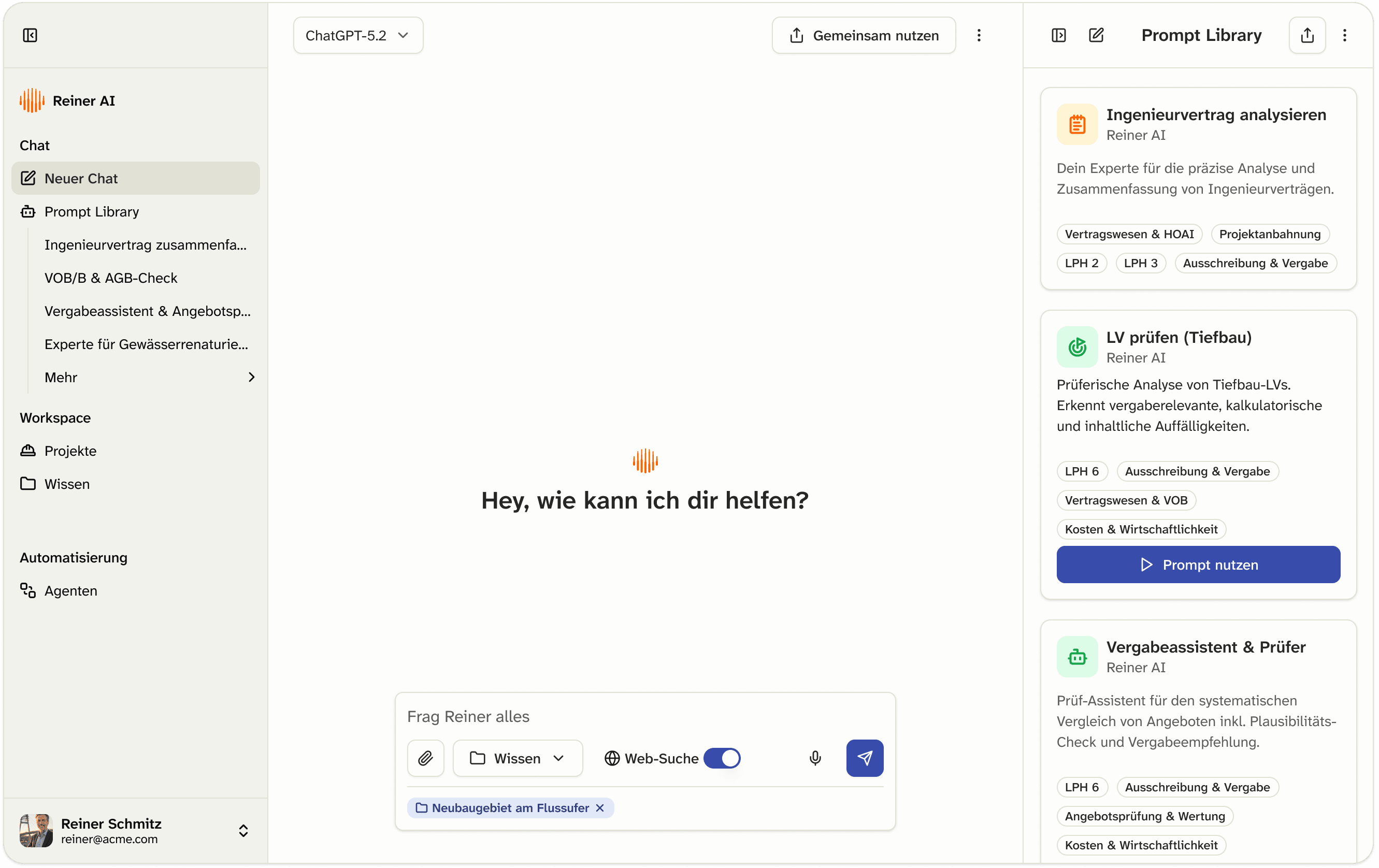 Reiner AI ist die erste KI, die für Bau und Planung gemacht ist. Mehr Produktivität, mehr Fachwissen, automatisierte Prozesse – für jedes Team-Mitglied. Vom ersten Tag an.