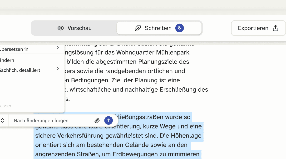 Erstellt einen strukturierten Erläuterungsbericht aus deinen Projektunterlagen. Du kannst Inhalte kommentieren, anpassen und den Bericht iterativ weiterentwickeln.