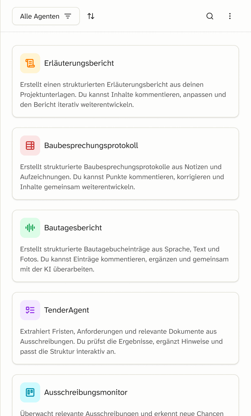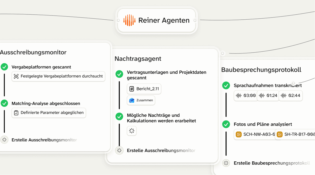 Reiner Agenten sind für speziell Bau- und Planungsprozesse entwickelt und übernehmen komplexe, wiederkehrende Aufgaben – präzise, steuerbar und zuverlässig.