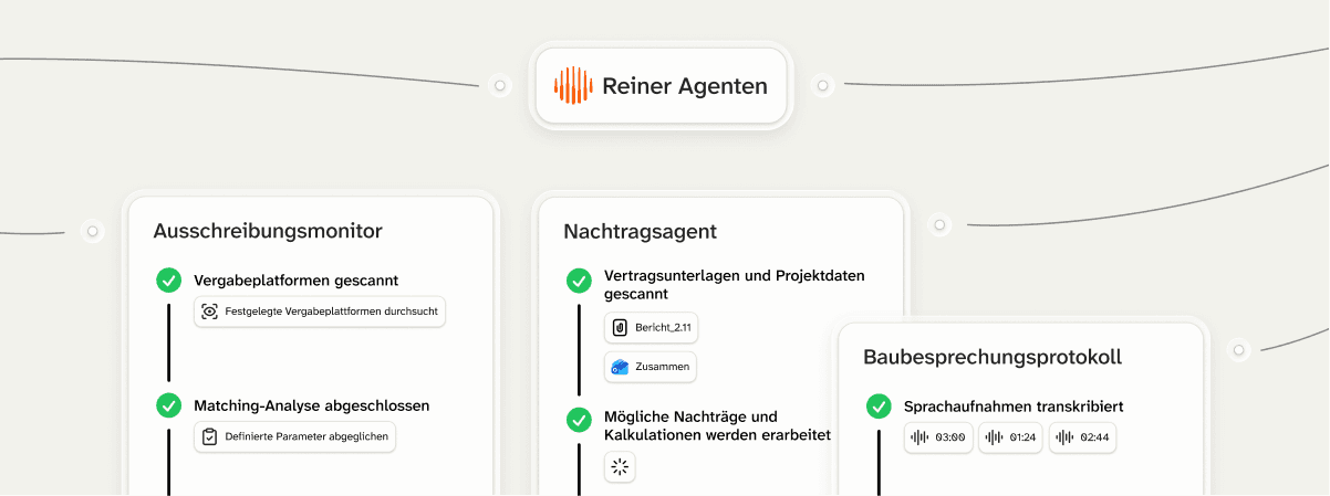 Reiner Agenten sind spezialisierte KI-Tools für konkrete Aufgaben, zum Beispiel Baustellenprotokolle, Erläuterungsberichte, Ausschreibungen oder Nachträge. Sie kombinieren Sprache, Struktur, Regelwerk und Projektdaten – und führen definierte Arbeitsschritte nachvollziehbar aus. Du gibst die Richtung vor, Reiner arbeitet entlang klarer Vorgaben.