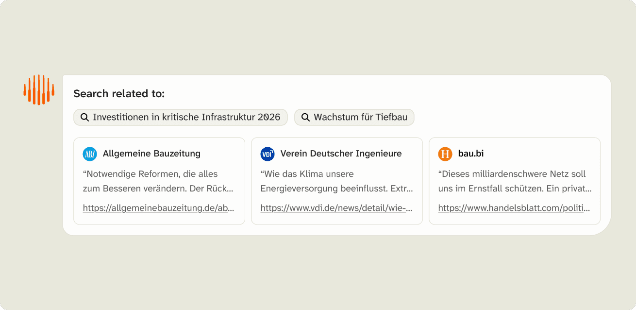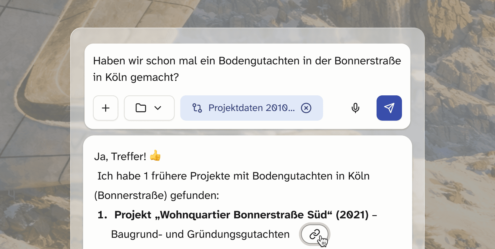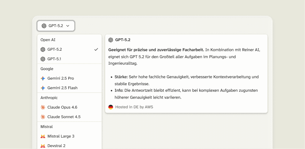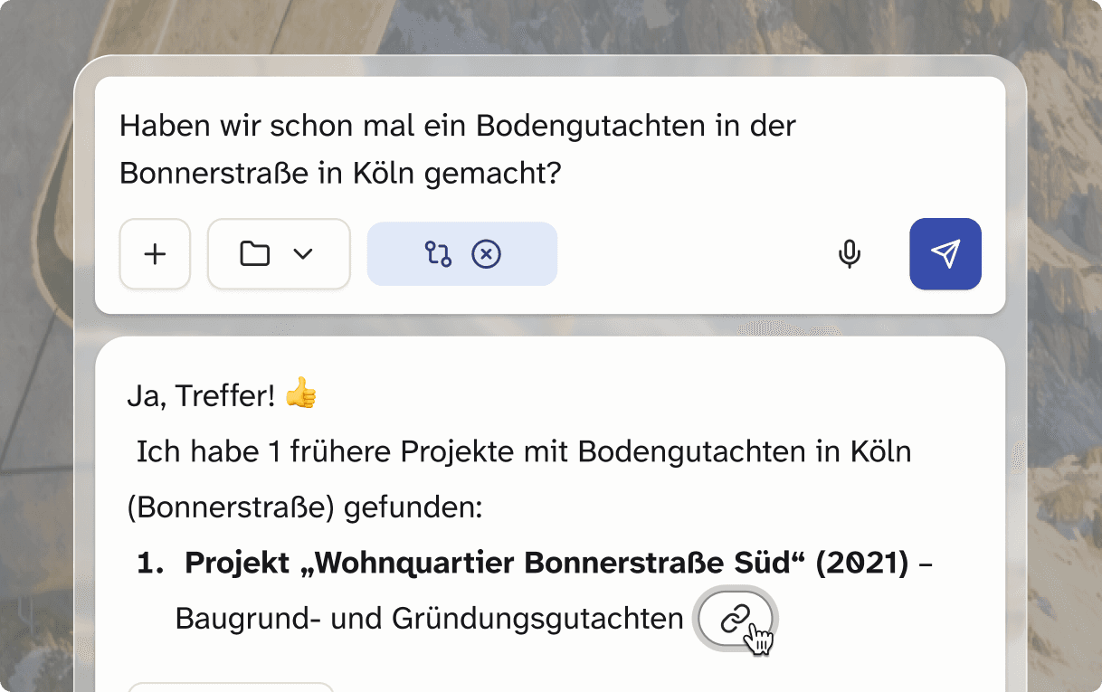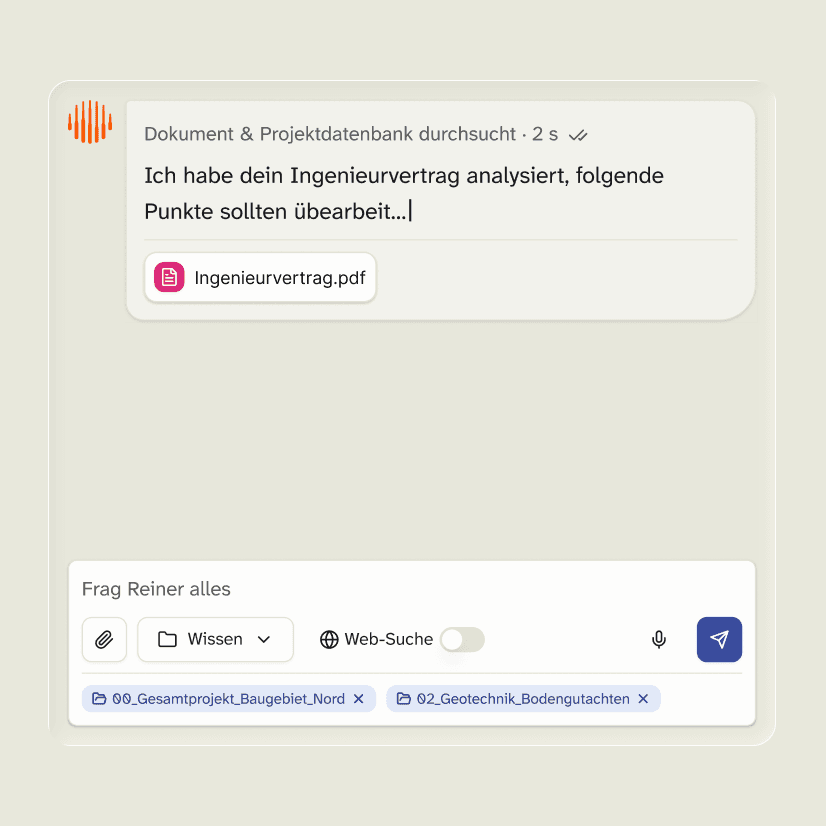 Deine KI-Zentrale für Bau und Planung. Liefert verlässliche Antworten, erstellt Dokumente, spart Zeit – für jede Abteilung. Sofort einsatzbereit und intuitiv nutzbar.